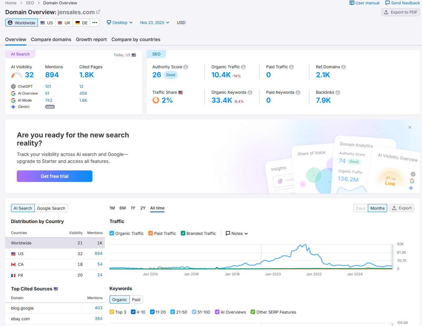 Authority Score: 26 Organic Traffic: 10.4K / month Organic Keywords: 33.4K Paid Traffic: 0 Referring Domains: 2.1K Backlinks: 7.9K Top Traffic Countries: US, CA, FR